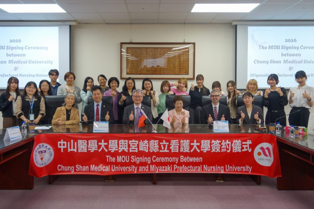 2026年3月19日、本学は中山医学大学(台湾台中市)と調印式を行い、過去2年間にわたり進めてきた提携関係を正式に締結いたしました。 本学の長鶴学長をはじめ、本学の台湾海外研修プログラムに参加していた学生8名と教員1名が、中山医学大学の学長、医学部長、看護学科長、国際交流部長、およびその他の教職員と共に調印式に出席しました。今回署名されたMOU(協定)により、両機関が学術分野および研究分野において、継続的かつさらなる連携を図るという合意が正式に発効いたしました。