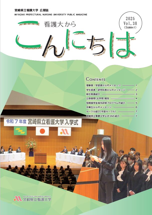 看護大学では平成18年(2006年)から、「看護大からこんにちは」という大学広報誌を年2回発行しています。学内でのトピックスや、地域のみなさんも参加するイベント、大学施設のご案内、卒業生の近況など、多彩な内容を盛り込んでいます。